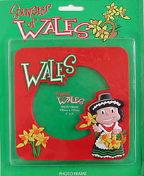 Sale! TY8. "Wales" frame has a charming Welsh girl with daffodils to enhance your photo or memento of Wales. Overall size of frame: 5 1/2 inches square. The picture opening is 3 1/2 inches high. Plastic. Packaged as shown. Was $9, now on sale at $5.