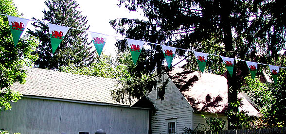 WF5. String of triangular flags, shown below left, and closeup of single flag, below right. (In Wales, they call this bunting.) The string is 33 feet long overall with 25 woven polyester flags on it. Each triangle is 12" long and 8 1/2 inches wide across the top. $9