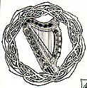 CG2E. Harp in Celtic wreath, black outlines, 3 1/2" across. $4