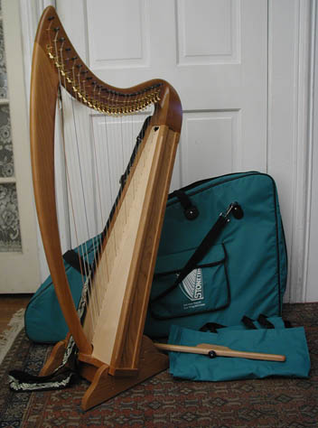 At left we show the cherry Even Song model harp sitting on its matching stand. It has a full set of Truitt levers and a harp strap, and comes with knee bones, green padded carrying case with side pocket for music, and matching green stand tote. Price also includes extra string set, tuning key, lever adjustment tools and string chart. Inclusive price for all items: $1799.00