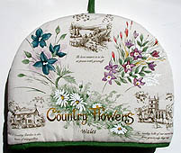 WT4. Country Flowers of Wales tea cosy, shown at left. Outer size: 12 1/2" wide, 10" high. Note that, because of thick padding, it will fit over a teapot with somewhat smaller measurements. 100% cotton fabric outside and lining, with polyester fill. Washable. $15